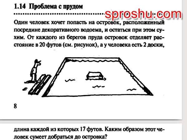 Девочка хочет добраться до островка, который находится посредине водоема. От каждого берега к нему по 10 метров. У девочки есть две деревянные доски, но длина каждой из них составляет 9 метров.
