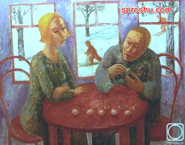Дело в том. что в основе его творчества лежат - ненужные подробности, одна из выставок, кстати, так и называлась "ненужные подробности". Здесь все - читающие люди, сплетнячущие, делающие какие-то незначительные вещи, которыми мы занимаемся круглые сутки. Из этого обилия ежедневной суеты, художник находит и воплощает в своих картинах какие-то жизненные сюжеты. В его картинах, так сказать, отражены излишние подробности человеческой жизни, все обязательно в движении, не статично. А основной посыл в его картинах, как резюмирует сам автор, следующий: