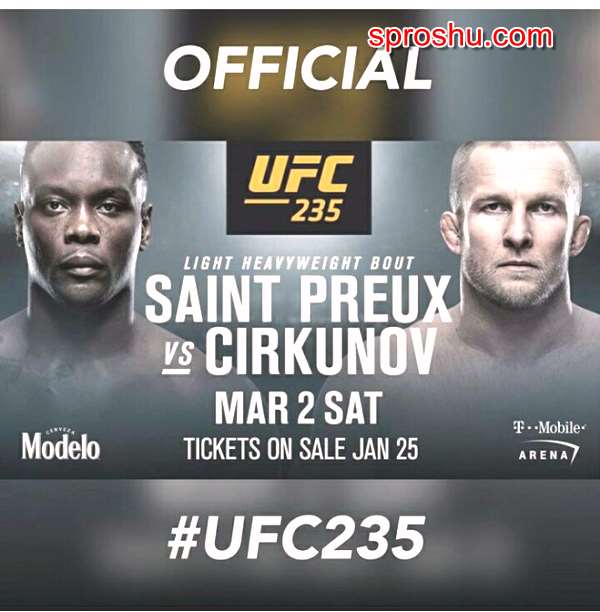 На турнире UFC 235, который состоится 3 марта 2019 года где русский с канадским паспортом Миша Циркунов подерется с Сейнт Прю, смотрите прямую трансляцию этого поединка на телеканале Матч ТВ в 06:00 по московскому времени. Поединок будет проходить в Лас-Вегасе.