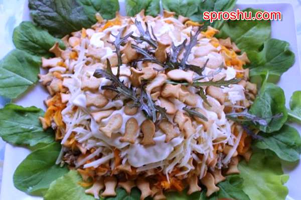 Для салата с печеньем нужно использовать солоноватое на вкус типа крекер. А ингредиенты могут быть различные. Вот один из вариантов:5 яиц варёных, 150 грамм твёрдого сыра, 1 баночка любой рыбы в масле, 27 штук квадратного солёного крекера, 1 зубчик чеснока, пучок зелёного лука, майонез. 1 слой-3Х3 в ряду и 9 штук в слое выложить печенье.Сверху выложить тёртые яйца и полить майонезом.2-3 желтка оставить для украшения салата сверху. 2 слой печенья крекер в такой же последовательностью.