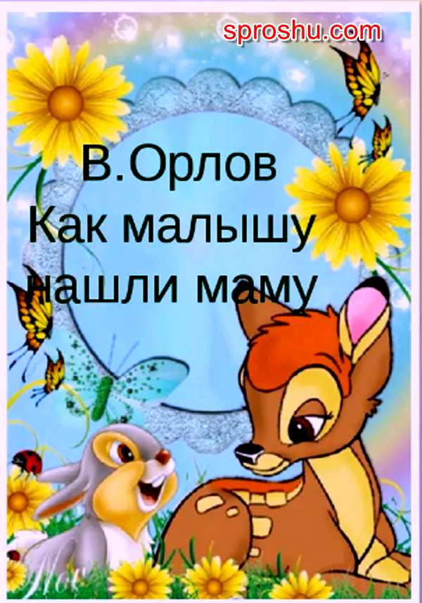 В сказке "Как малышу маму нашли" автор Владимир Орлов рассказывает нам о том как однажды в лесу один малыш заблудился. Малыш был весь в оранжевых пятнышках и у него были очень тонкие ножки. Малыш очень сильно плакал, он был сильно напуган. Услышали звери, что в лесу сильно плачет малыш и повылазили из своих нор. Сорока предложила малышу выбрать любую маму, но малыш даже слушать ничего не хотел, он искал свою единственную и любимую мамочку.