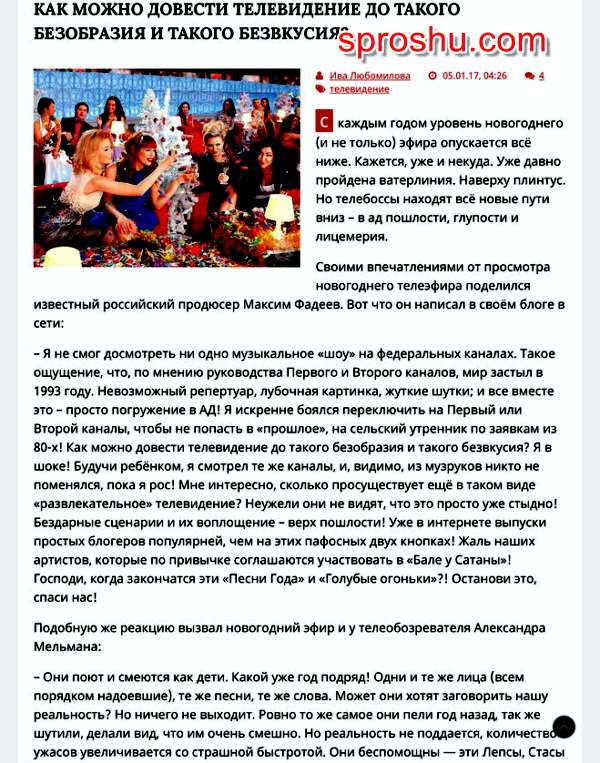 Забудем на минуточку, кем является Фадеев и какой продукт он выпускает. В Новый год он оказался в роли обычного зрителя, такого, как все мы. Ну, может быть глубже погруженного в специфику ТВ. Я думаю, те артисты, певцы ртом и танцоры ногами, которых нам в очередной раз явили в новогоднюю ночь, сами свои выступления не смотрели и ужаснутся не смогли. Остается надеяться, что в их твиттерах, инстаграммах и телеграмм появится как можно больше негативных отзывов. Но и они не заставят этих "деятелей культуры" отказаться от тех денег, которые они получают, снимаясь во всем этом безобразии.