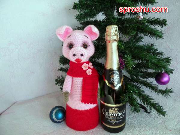 Как связать чехол на бутылку в виде свинки или поросенка?