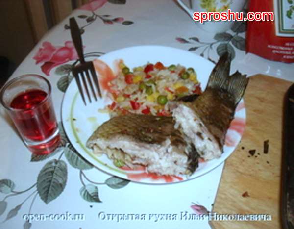 Если рыба небольшая и не жирная, то можно добавить растительное масло. Внутрь я кладу репчатый лук, порезанный кольцами и моркову. Запекать в зависимости от размера рыбы от часа до полутора. На гарнир рис или картофель.