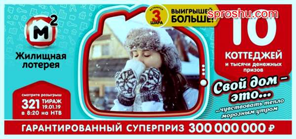 Насколько мне известно, в 321-м тираже "Жилищной лотереи" главными призами будут являться целых 10 коттеджей, различные денежные выигрыши, а также имеющаяся возможность выиграть гарантированный суперприз размером в 300 миллионов рублей. Кстати, 321-й тираж "Жилищной лотереи" состоится в субботу, 19 января 2019 года, и на его лотерейном билете написано, что "Свой дом - это чувствовать тепло морозным утром".