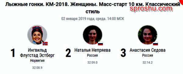 Отлично выступили в наступившем году в рамках Тура де Ски Кубка мира по лыжным гонкам российские лыжницы второго января в женском масс - старте на десять километров классическим стилем. Второе и третье место завоевали в этом старте Непряева Наталья и Анастасия Седова. В топ - десятку попала еще одна спортсменка из России - Белорукова Юлия. А пальму первенства взяла норвежская лыжница Ингвильд Флугстад Эстберг.