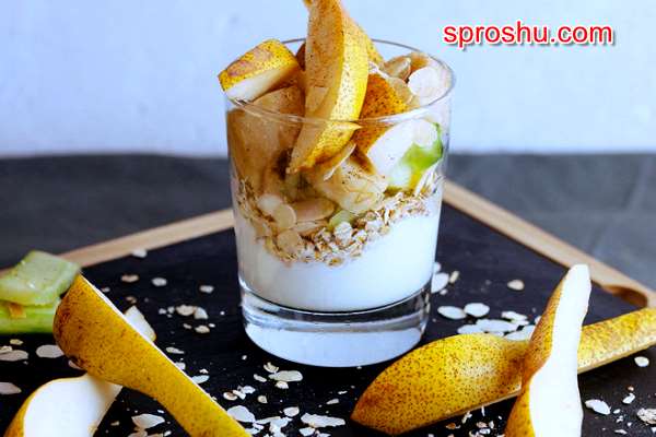 Можно груши смешать с йогуртом и овсяными хлопьями. Это такой вариант будет полезного завтрака из груш.
