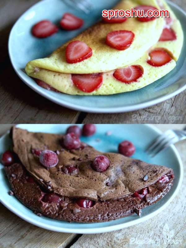А можно при приготовлении омлета влить в него шоколад растопленный. Но омлет готовить не с солью а с сахаром либо мёдом. Но так как шоколад сладкий то лучше не добавлять ни сахар ни мёд. И дополнить омлет ягодами.