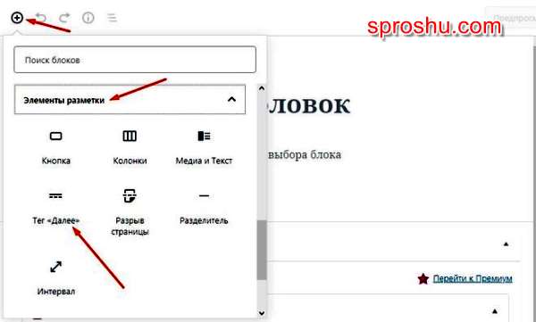 Как в Guttenberg для Wordpress вставить тег more (разделить статью)?