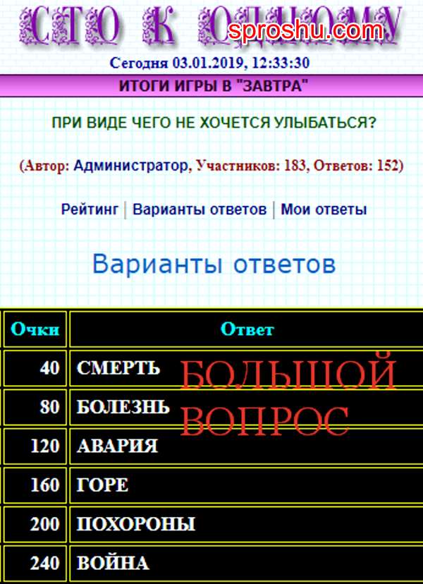 Смерть - улыбаться совсем не хочется при виде смерти, такому ответу принадлежит верхняя строчка и начисляется 40 очков;