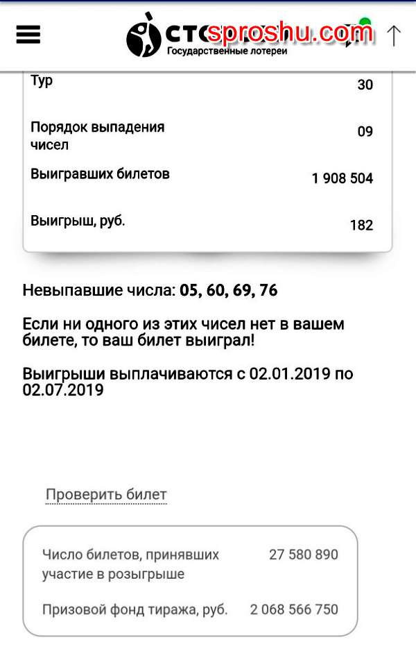 В итоге большинство участников лотереи конечно же остались не довольны, так как практически у всех купленных билетов хоть одно да присутствовало число из четырех: 5, 60, 69, 76. А это значило только одно - что билет ничего не выиграл.