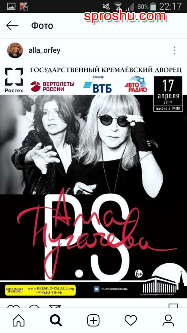 Судя по информации в Инстаграм аккаунте певицы концерт пройдет 17.04.2019 года в 19.00 в Государственном Кремлевском Дворце. Концерт юбилейный, ведь Алле Борисовне исполняется 70 лет.