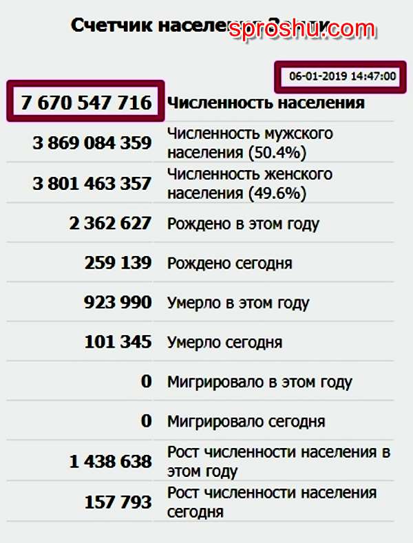 6 января 2019г. счётчик населения Земли сайта countrymeters.info выдаёт такие цифры: