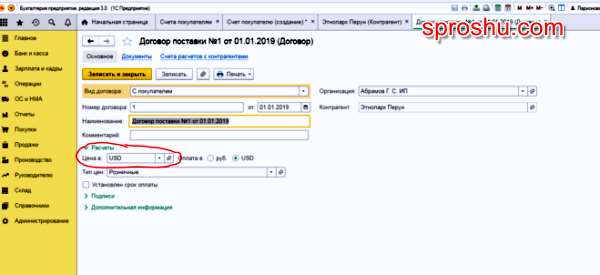 - в окне документа счет на оплату выбрать контрагента и вновь созданный договор, ввести продаваемую номенклатуру и указать цену в рублях. Справочно в окне будет показан курс валюты на указанную дату