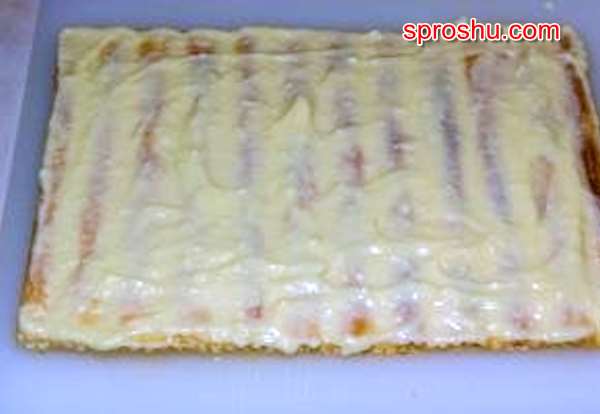 Один корж обильно промажем приготовленным кремом и закроем вторым коржом. Его тоже промажем кремом, обсыпем верх и бока измельчённой крошкой и на восемь часов отправим в холодильник для пропитки. Через восемь часов вытащим торт "Наполеон" из двух слоеных коржей из холодильника, нарежем на порционные куски и в тарелке подадим на стол к горячему чаю. Приятного аппетита!