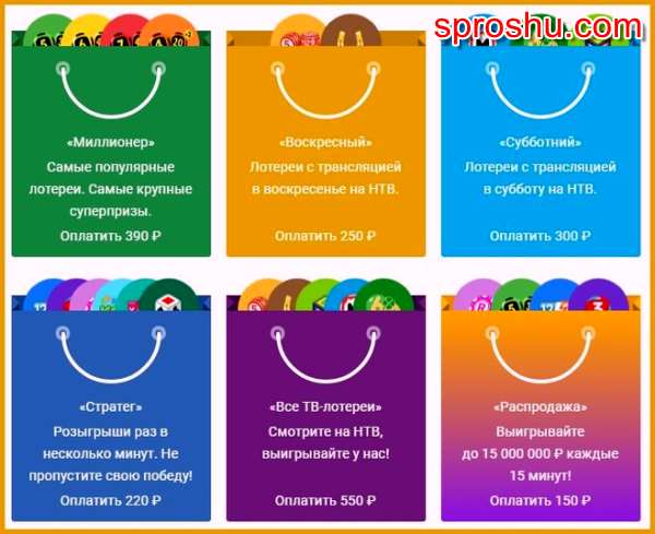 Но как бы там ни было, на одной из страниц сайта перечислено шесть видов пакетов, среди которых "Миллионер" и "Стратег", "Воскресный" и "Субботний", "Все ТВ-лотереи" и "Распродажа".