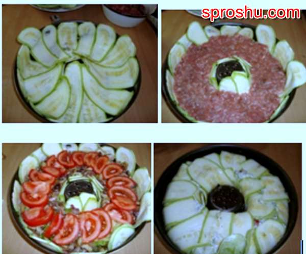 Смазываем её растительным маслом, укладываем кабачки, так чтобы края кабачков свисали и выкладываем фарш. Картинки выложила специально, для большей наглядности.Следующи