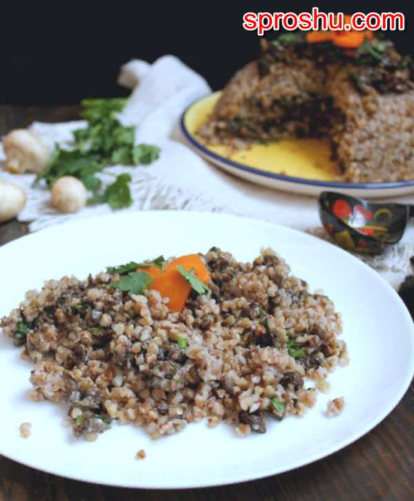 На гречку положим прижаренные со сливками шампиньоны и ложкой слегка утрамбуем. На грибы положим половину оставшейся гречки, потом грибы в сливках и остатки гречки. Всё утрамбуем ложкой, накроем миску тарелкой и перевернём гречневую кашу на тарелку.
