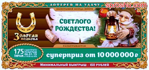 Розыгрыш 175 тиража лотереи "Золотая подкова" состоится 6 января 2019 года, перед Рождеством. Время розыгрыша в 14::00, канал трансляции НТВ. На лотерейном билете обновленного дизайна покупателей привлекает надпись о том, что будет разыгран суперприз от 10 000 000 рублей, а минимальный выигрыш составит 150 рублей. Лицевая сторона лотерейного билета представлена ниже.