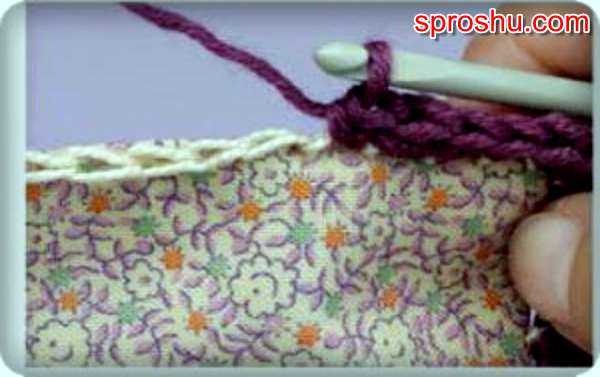 Можно предложить и другой вариант. Для этого обвязать край ткани крючком и одним рядом столбиков без накида, как показано на нижнем рисунке. Затем этот край соединить с вязаным полотном кеттельным швом. Этот метод описан в вопросе: