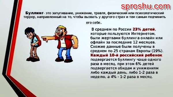 Буллинг это иными словами травля. Зачастую буллинг происходит среди детей среднего возраста в таких учреждениях как школа, кружки, детские лагеря. Противостоять этому можно: