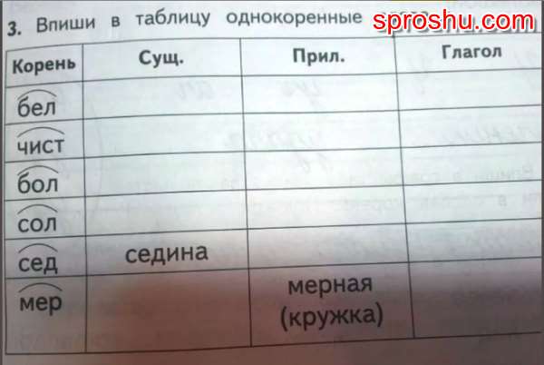 Как вписать в таблицу однокоренные слова бел, чист ... (см)?
