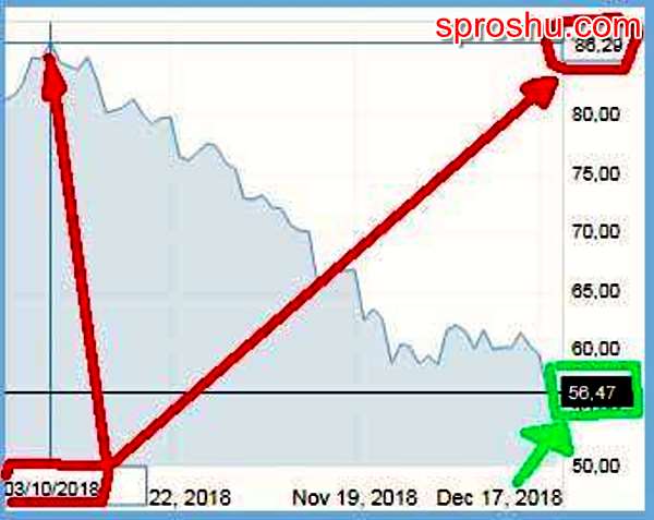 Это огромная разница в ценах на нефть для столь короткого периода. Нефть обесценивается "семимильными шагами", если можно так сказать - 18 декабря 2018 баррель нефти Brent стоил 55.98 долларов, а ещё 17 декабря 2018 цена была на 9% дороже 61.02$.