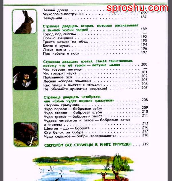 Плешаков рассматривает животных, кажется, по размеру: сначала идут рассказы про мышек, потом - про всё более крупных зверей. Такая логика связана с тем, что в "Зеленых страницах" рассматривается самый сложный период - зимний. В этом есть свой смысл, ведь часто даже взрослые плохо представляют себе, каково это - жить в лесу зимой, когда кругом белый снег. Но если нужен рассказ именно о видах животных, их классификации, то книги Плешакова тут не хватит. Родителям придется вспомнить свои основные познания классификации Линнея.