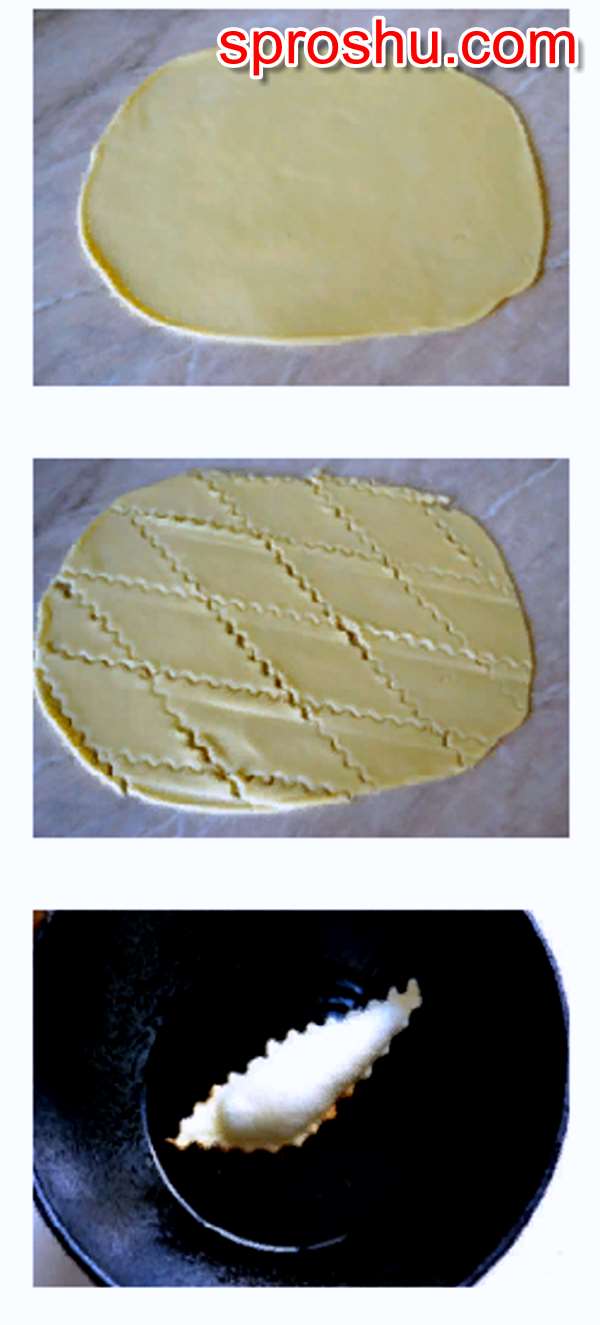 Для начала насыпем в подходящую посудину муку. Добавим размягчённое сливочное маслице и как следует всё разотрём до однородности. Затем всыпем щепотку поваренной соли, вольём тёпленькое молочко и вымесим мягкое упругое тесто. Завернём его в плёнку и на полчаса уберём в сторонку отдыхать. Через полчаса раскатаем тесто в лист и нарежем его на ромбики длиной в десять сантиметров.