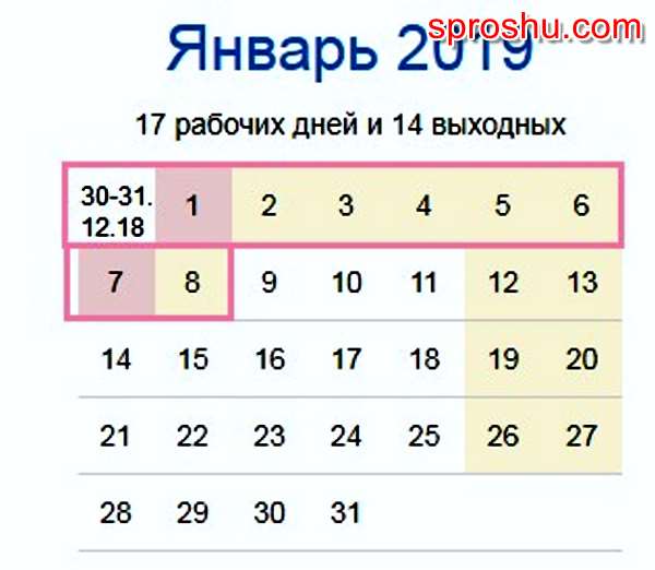 Однако напоминаю, что на субботу, 29 декабря 2018 года переносится рабочий день с понедельника, 31 декабря. Субботу все отрабатывают, а воскресенье, тридцатое декабря, и понедельник, 31 декабря 2018 года, присоединяются к январским каникулам.