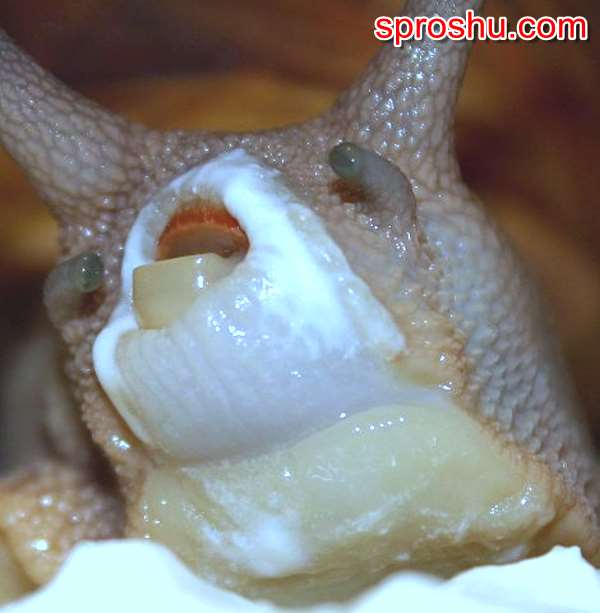 Улитка также ,как животные и человек ,имеет зубы ,которые располагаются на её языке . Количество зубов зависит от вида и возраста моллюска ,но в среднем их количество варьируется от 10 до 30 тысяч . Следует отметить,что улитки имеют самые крепкие зубы среди всех живых существ на планете ( их зубы состоят из вещества гётита ,в свою очередь ,в состав которого входит железо ). Следует сказать ,что улитка не кусается и если вы поднесёте палец ,то почувствуете нежное посасывание или скрабирование .Не зря этих моллюсков , в последнее время ,так активно стали применять в уходе за кожей в косметологии.