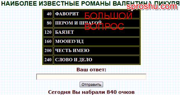 Фаворит - исторический роман Валентина Пикуля откроем на верхней строчке и начисляем 40 очков;