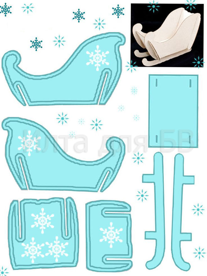 Распечатываем шаблон, вырезаем детали и переносим уже их на лист пенопласта. Его берем не толстый, сантиметров пять толщиной хватит. Обводим детали маркером или карандашом. Затем застелите рабочее место клеенкой потому что пенопласт может сыпаться во все стороны. Теперь секрет, нужно лезвие ножа нагреть и это можно сделать с помощью огня на газовой конфорке например. После нагрева нож будет резать пенопласт словно масло и очень ровно. Далее вырезаем все детали, делаем специальные прорези как показано на шаблоне выше и собираем наши сани из пенопласта. Осталось только их красиво декорировать.