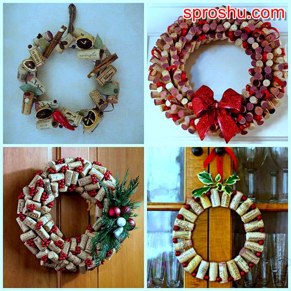 Прежде чем приступать к изготовлению венка, нужно набрать необходимое количество пробок. Основу можно купить готовую, либо же сделать ее самостоятельно. Подойдут для этого ветки, папье-маше, проволока, газета и т.п. Пробки начинаем приклеивать с внутренней стороны основы. При приклеивании размещайте каждую пробку немного под углом.