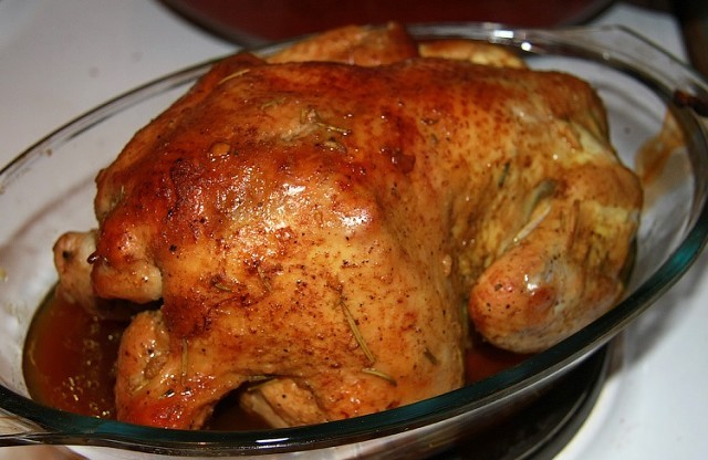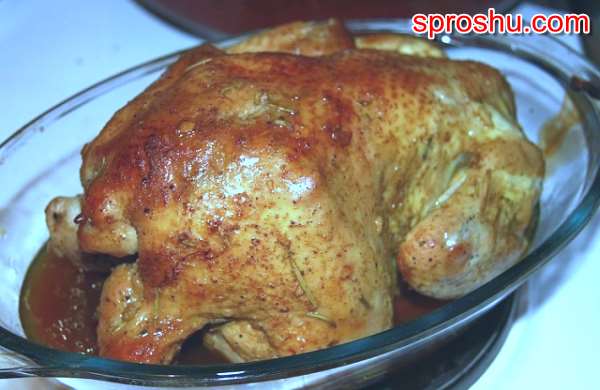 Возьмём целую среднего размера курицу, промоем её и срежем лишний жир. Для соуса нальём в подходящую ёмкость рюмку водки, рюмку подсолнечного рафинированного масла, полрюмки соевого соуса и перемешаем. Добавим одну большую ложку свежего мёда, половину маленькой ложки красного жгучего перчика и снова как следует перемешаем. Курицу положим в огнестойкую форму и польём на неё приготовленный соус. Отправим форму с курицей в духовку на мелкий огонь на два часа. Периодически поливаем курицу соусом, черпая его со дна формы. Через два часа вытащим из духовки похожую на тропиканку аппетитную румяную курицу и с любимым гарниром, например с рисом подадим на стол. Приятного аппетита!