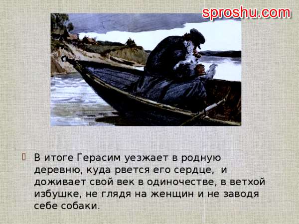 Почему же Герасим утопил собаку, а не ушел с ней? Наверное, потому что автор хотел нам показать исполнительность, обязательность героя, а судьбу его сделать трагичной, сделав Герасима одиноким.