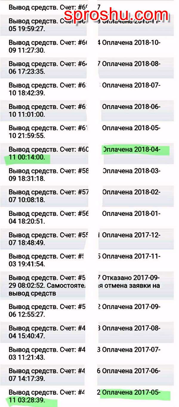 И тем не менее, пересмотрев свою текущую страницу с выводом средств, я обнаружила, что в период с мая 2017 по настоящее время два раза были перечисления 11 числа, это 11.05.17 в 03.28 и 11.04.18 в 0.14.