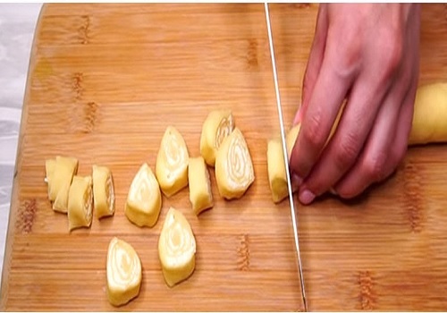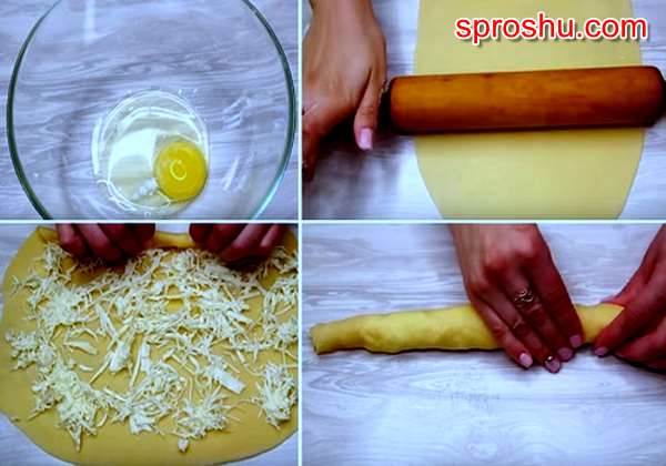 Для начала сделаем рулеты. В миску разобьём яйцо, всыпем поваренную соль и слегка перемешаем. Насыпем муку и вымесим тесто. Сливочный сыр натрём на тёрке со средними отверстиями. На тонко раскатанное тесто равномерно распределим натёртый сыр и скатаем в рулет. Немного прижмём рулет ладошкой, защипнём края и нарежем его на тоненькие кружочки.