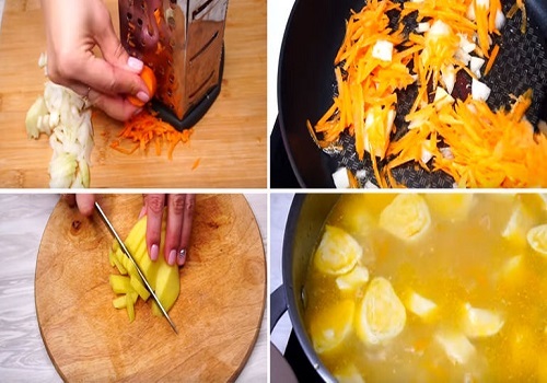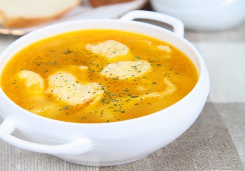 Для приготовления супа потребуются два литра куриного бульона, одна луковица, четыре картофелины, одна морковка, две дольки чеснока, половина чайной ложечки поваренной соли, один пучок укропа, одна большая ложка сливочного маслица, чёрный перец.