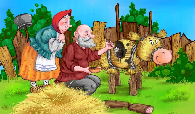 В сказке "Бычок смоленой бочок" рассказывается о девочке Танюшке, которой очень захотелось иметь красивого бычка, и дедушка решил ей его сделать. А сделал он его из соломы и для прочности смазал бока бычка смолой. Бычок ожил, Танюшка очень обрадовалась и отвела бычка пастись на пастбище. Сначала к бычку приклеился медведь и за своё освобождение пообещал принести мёда, потом волк пообещал орехи, и наконец заяц - капусту. Все звери своё обещание сдержали!