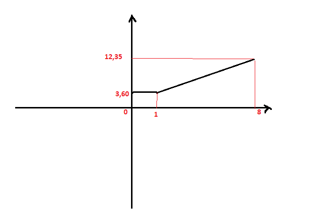 Очевидно, что зависимость будет такая: стоимость поездки от расстояния. Данная функция определена на промежутке (0;8) и имеет следующий вид.