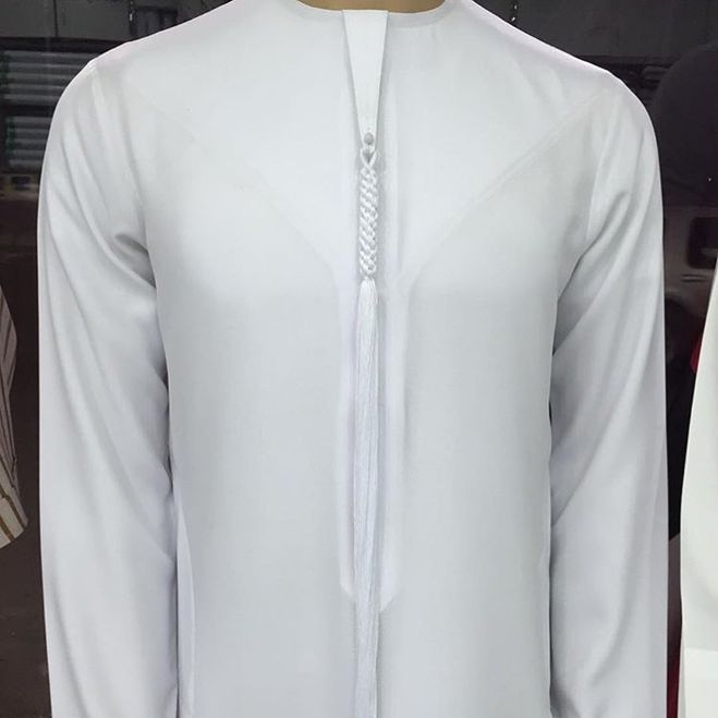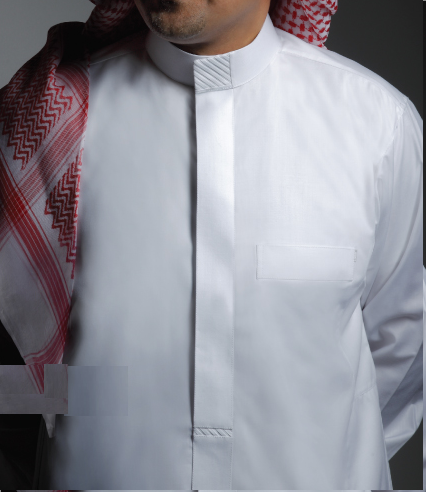 Стоит заметить, что часто в арабской одежде присутствует втачная планка с застежками на пуговицах или молнии (эмиратский вариант). В таком случае идет воротник-стойка безворотниковый вариант. Нередко в нем присутствует и кисточка (каркуша), на которую наносятся духи.