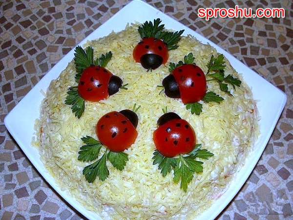 Лет пять назад мы с кумой случайно смешали два похожих салата. Её: вареная куриная грудка, свежий помидор, копченое бедрышко, сыр, майонез. И мой: вареная куриная грудка, ананас, сыр, майонез. В последствии мы добавили к нему жареные шампиньоны.