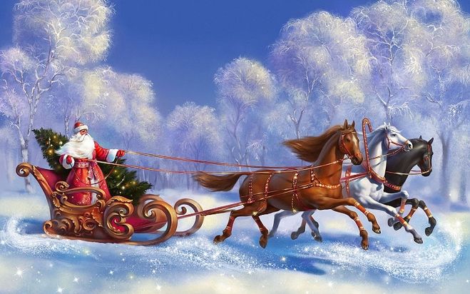 Дед Мороз тоже не пешком ходит, его изображали едущим так же в огромных санках, но везли ее резвые длинногривые лошади. Обычно их трое, потому что тройка лошадей - это как признак лихачества, и статуса, и резвости езды, прокатиться на тройке-то) Обычно ездит по снегам, но и в небо лошади тоже могут подняться.