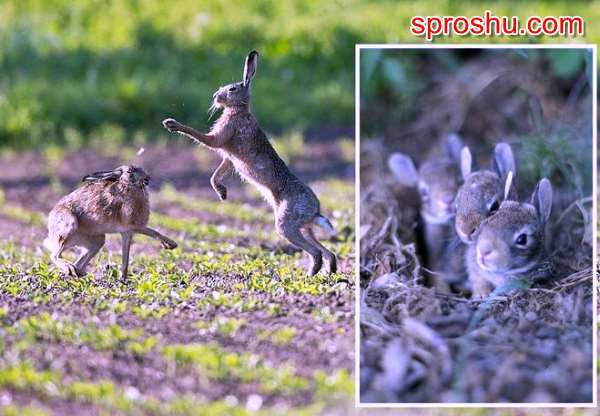 Русак норки не роет, он залегает под кустами или поваленными деревьями. Зайцы за свою жизнь приносят большое потомство. Обычно у них рождается от одного до девяти зайчат. Это зависит от условий жизни, количества корма, климата. Летом зайчат рождается больше, а в холодное время года меньше. Мама роет небольшую ямку и делает гнездо из травы. Зайчата остаются одни, лежат тихо и ждут, когда придёт мама и покормит их. Зайчихи выкармливают не только своих детёнышей, но и любых других, которых встретят в лесу.