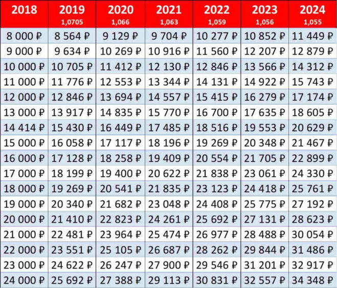 Вот таблица, наглядно показывающая индексацию пенсионного коэффициента и фиксированной выплаты по годам. Таблица полностью основана на ФЗ-№350: