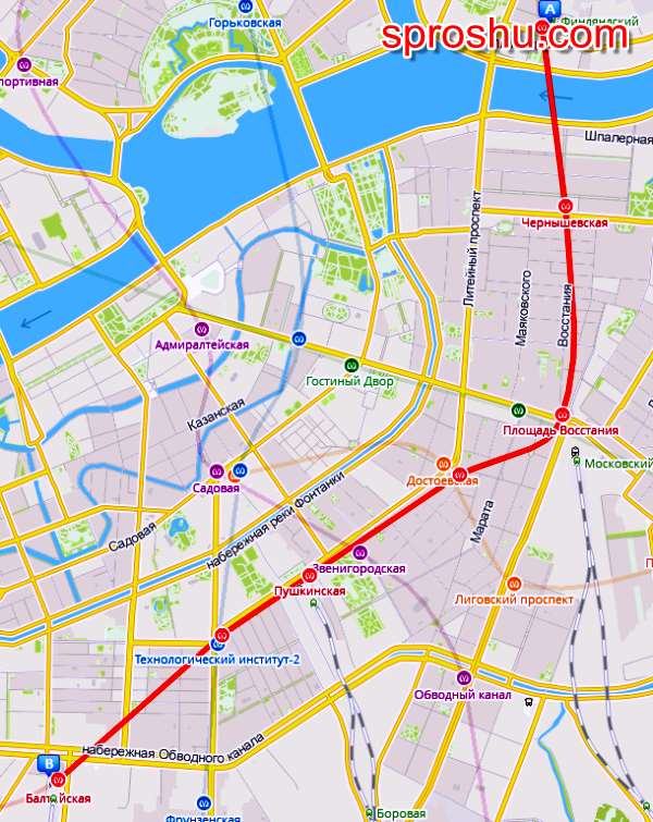 Непосредственно в здании Финляндского вокзала имеется вход на станцию метро "Площадь Ленина" Кировско-Выборгской (М1) линии (на схеме метро красного цвета), а в здании Балтийского вокзала - выход из станции метро "Балтийская" этой же линии. Разделяет их только 5 промежуточных станций.