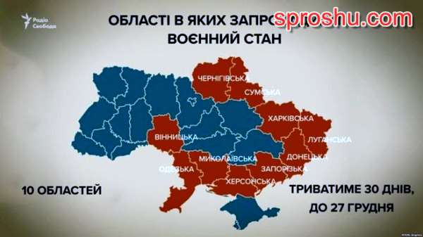 В общем, проголосовали депутаты, и решили ввести так называемое военное положение аж на 30 дней в следующих областях и во внутренних водах Керченской акватории. Естественно, это области приграничные с Россией, и другие попали тоже. Вот свежая статья по этому поводу.