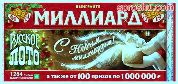 Насколько мне известно, в настоящее время на официальном сайте компании "Столото" сообщается, что купить лотерейный билет 1264-го тиража "Русского лото", в котором будет проводиться праздничный розыгрыш "Новогоднего миллиарда", можно будет ровно до 11 часов вторника, 1 января 2019 года, по московскому времени. Конечно же, лучше всего не тянуть до последнего момента, а сделать это заранее.