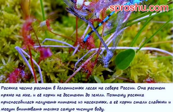 Ну и чтобы ребенку было совсем интересно, на десерт возьмите хищное растение. Сначала в горшке, и лучше взять фото, где горшок с автополивом. Первый слайд: это - росянка, хищное растение. Их очень сложно выращивать дома, потому что они не выносят жесткой воды с примесями и могут расти только в торфе. Росянки способны питаться насекомыми, и вместо удобрения им надо давать мух или личинок. Слайд с росянкой в природе: